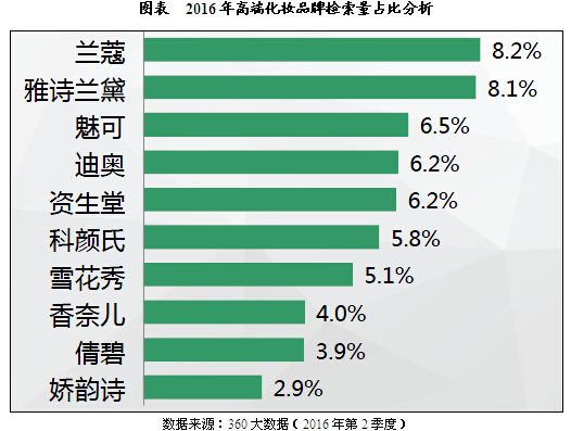 2016年,高端品牌,品牌數(shù)量少集中度高,Top10品牌檢索量占比近60.0%,其中雅詩蘭黛和蘭蔻排名前兩位,檢索量占比均在8.0%左右。