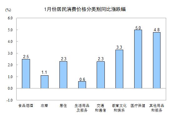 1月份,其他七大類價(jià)格同比均有所上漲。其中,醫(yī)療保健、其他用品和服務(wù)、教育文化和娛樂、居住、交通和通信、衣著、生活用品及服務(wù)價(jià)格分別上漲5.0%、4.8%、3.3%、2.3%、2.3%、1.1%和0.6%。