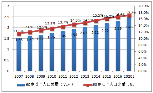 《 2017-2022年中國養(yǎng)老產(chǎn)業(yè)發(fā)展現(xiàn)狀及未來投資方向研究報告 》 中國人口老齡化趨勢預(yù)測 據(jù)統(tǒng)計,2015年60歲及以上人口達到2.22億,占總?cè)丝诘?6.15%。預(yù)計到2020年,老年人口達到2.48億,老齡...
