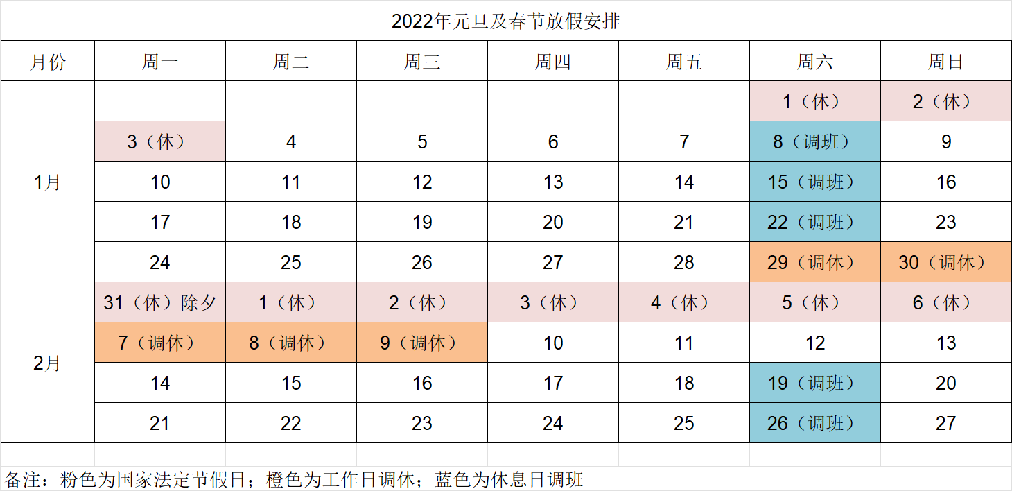 附錄:2022年元旦,春節(jié)放假日歷