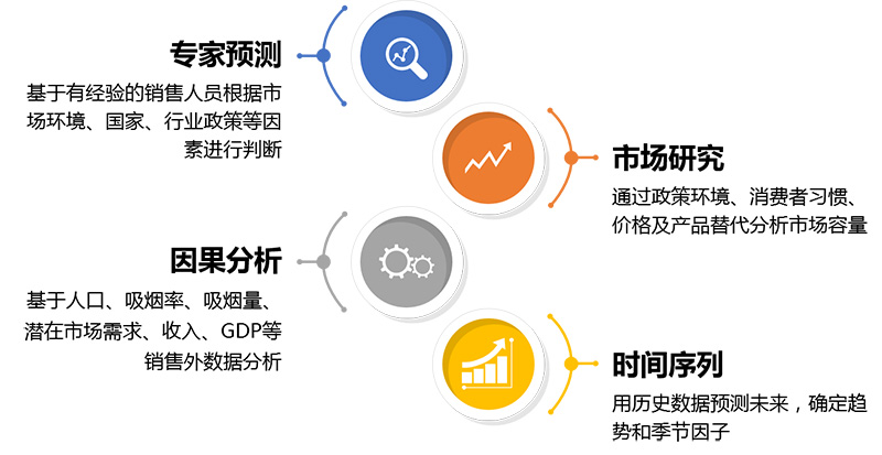 華夏經(jīng)緯在多年服務(wù)國內(nèi)煙草行業(yè)的經(jīng)驗(yàn)基礎(chǔ)上,對市場容量推算和預(yù)測有著成熟的理解,在實(shí)操中將融合常見的幾種市場容量預(yù)測模型。
