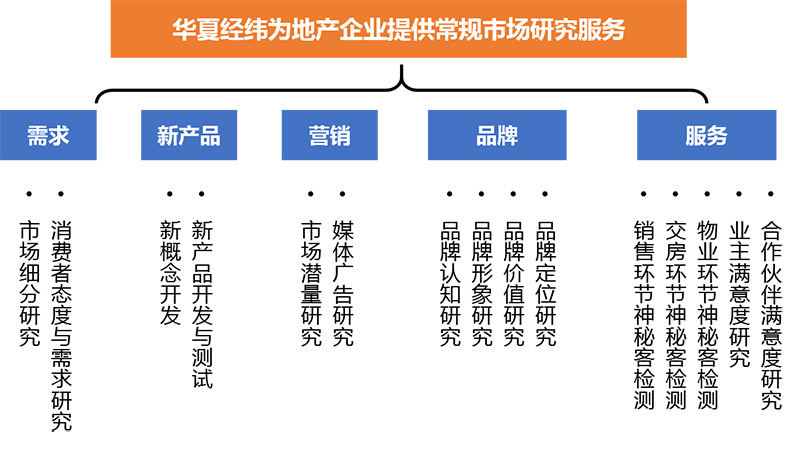針對(duì)地產(chǎn)企業(yè)的不同業(yè)務(wù)部門/模塊,華夏經(jīng)緯提供多樣化、全覆蓋的市場(chǎng)研究服務(wù),全面助力專項(xiàng)業(yè)務(wù)能力提升。