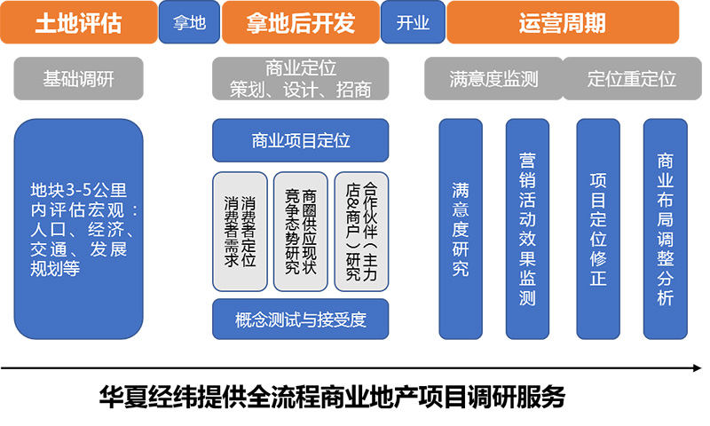 針對(duì)項(xiàng)目開(kāi)發(fā)的不同工作階段,華夏經(jīng)緯提供覆蓋全開(kāi)發(fā)流程的市場(chǎng)研究作為智力支持。