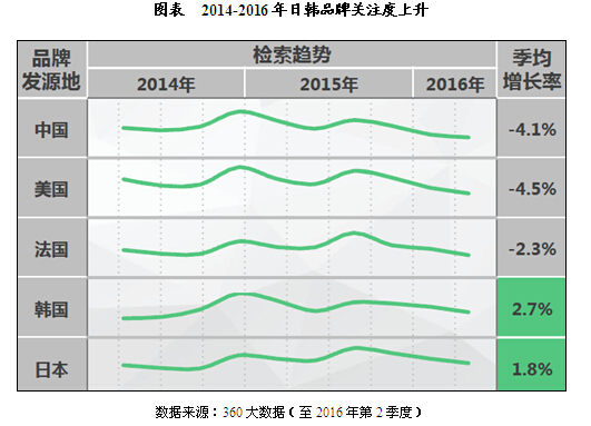 此外,從發(fā)展趨勢看,2014-2016年,日韓品牌的關(guān)注度增速最快。