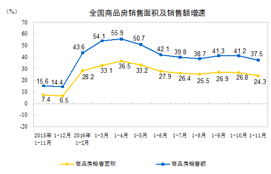 2016年1-11月份全國房地產(chǎn)開發(fā)投資和銷售情況